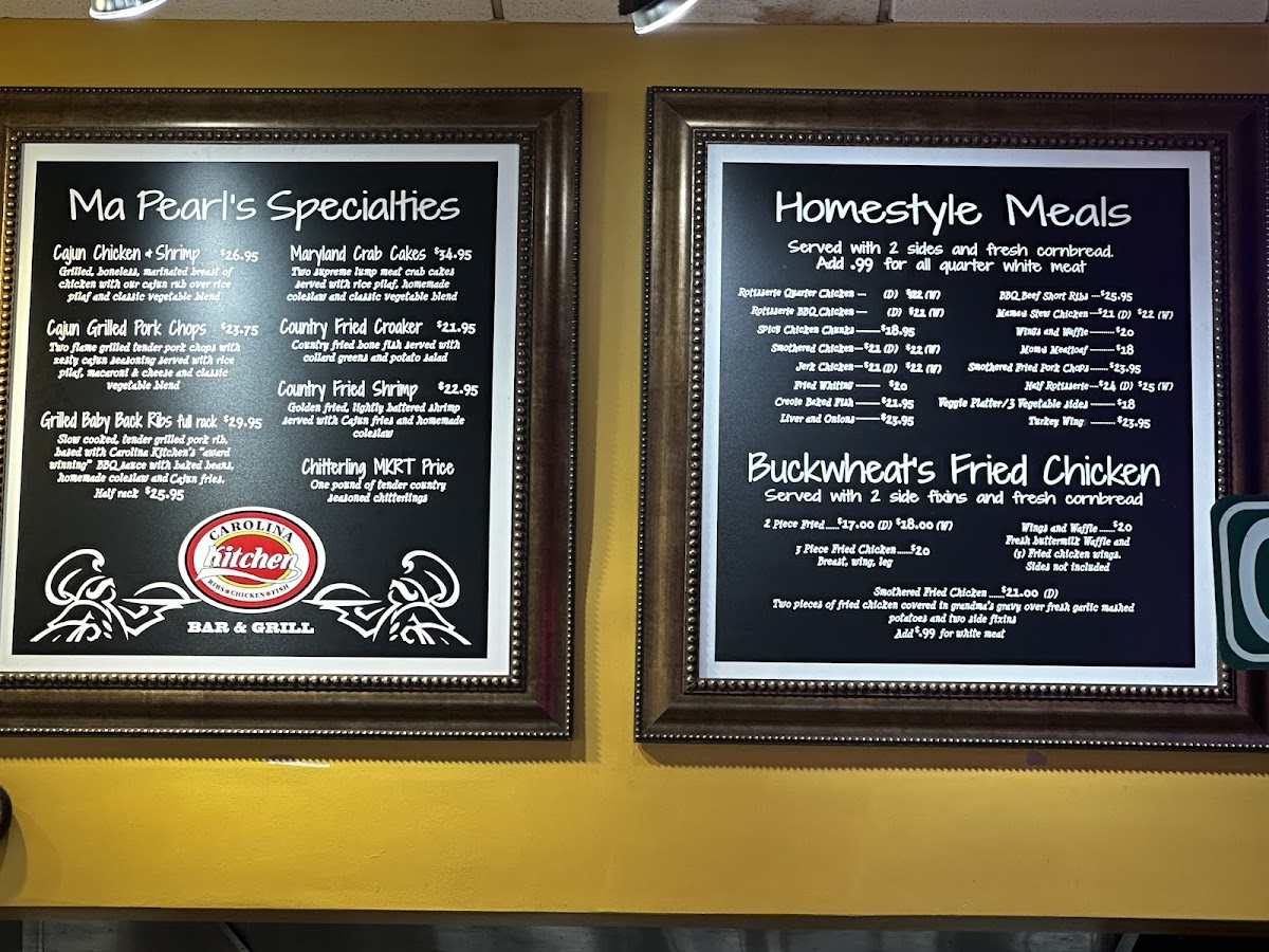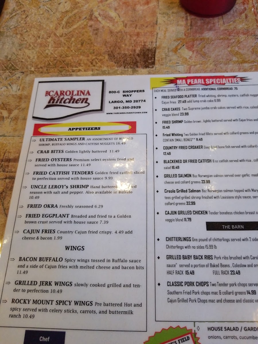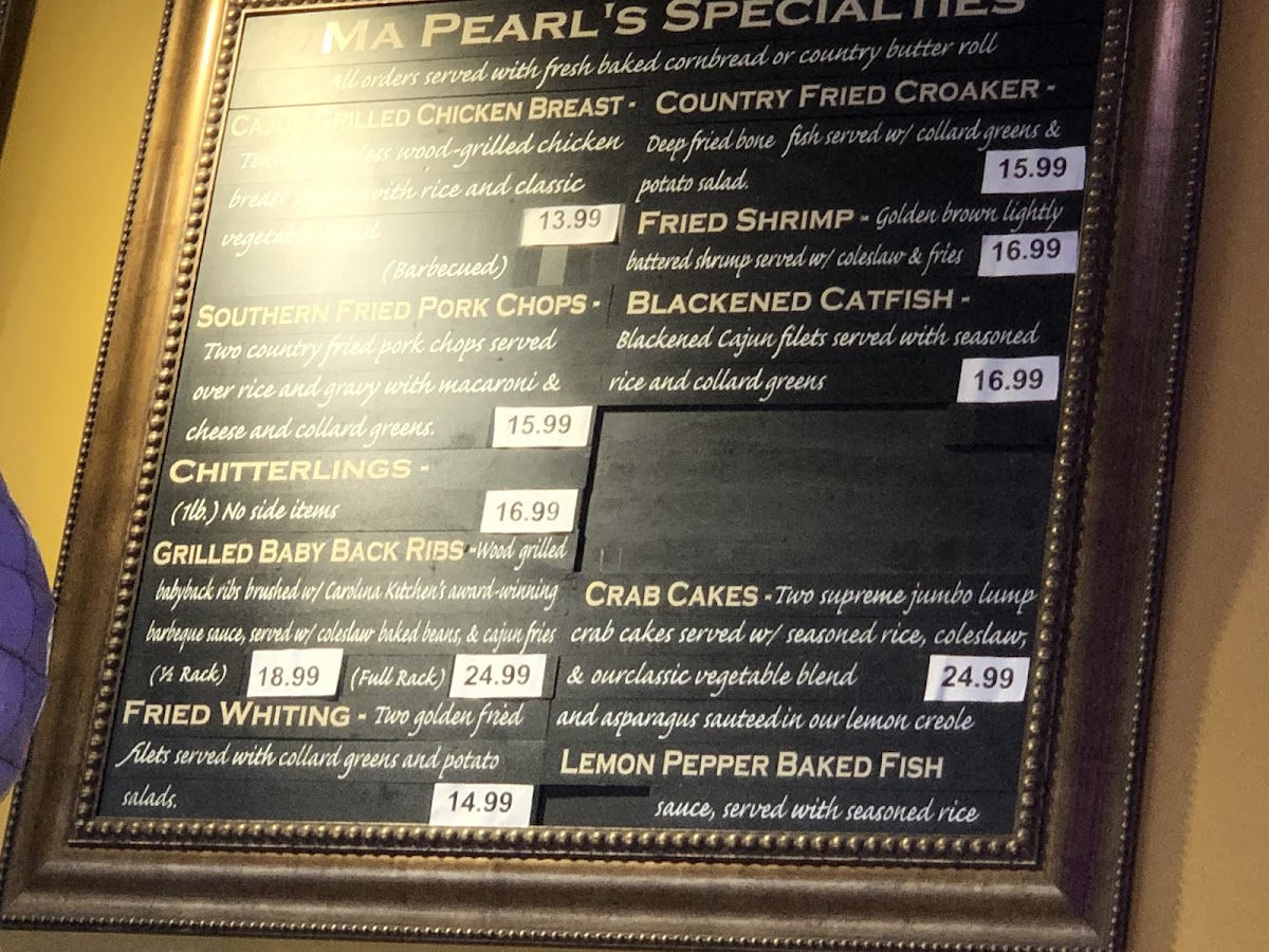 - Ma Pearl's Specialties: Featuring a variety of seafood and meat dishes such as Blackened Catfish, Chesapeake Platter, Maryland Crab Cakes, Creole Salmon, and family-sized platters suitable for group dining.