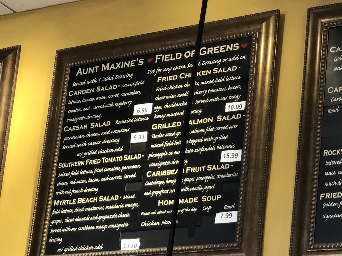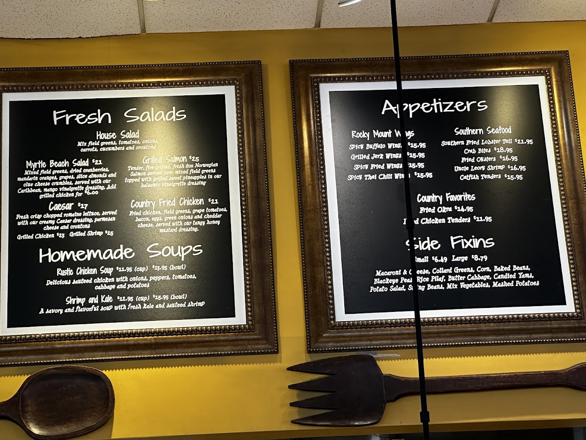 The menu offers a variety of Southern cuisine dishes, structured into several distinct sections to accommodate different dining preferences. Patrons can find options ranging from salads and homestyle meals to specialty seafood and barbecue selections.