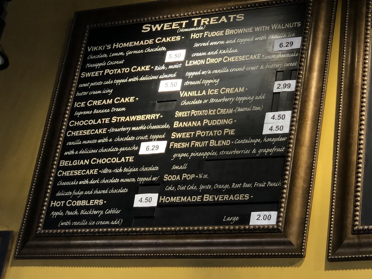 The menu includes both individual meals and family-style meals, suitable for casual dining occasions. Offerings incorporate traditional Southern staples like macaroni and cheese, collard greens, sweet potatoes, and cornbread. There is also a selection of vegan and vegetarian options, including items like Vegan Banana Pudding Cake. Portions vary by item, with some larger family-sized platters designed for shared meals.